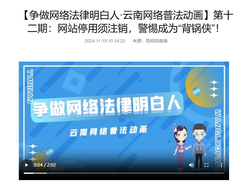 网络法治关系国家安全、社会稳定与人民利益,由昆明市委网信办指导,昆明信息港以网络安全法、数据安全法、个人信息保护法、未成年人网络保护条例等法律法规为主,推出了《争做网络法律明白人·云南网络普法动画》动画栏目,制作系列网络普法漫画,以生动有趣、通俗易懂的动画形式,让法律条文跳出书本,走进千家万户,向公众普及法律知识、提升全民法治意识。