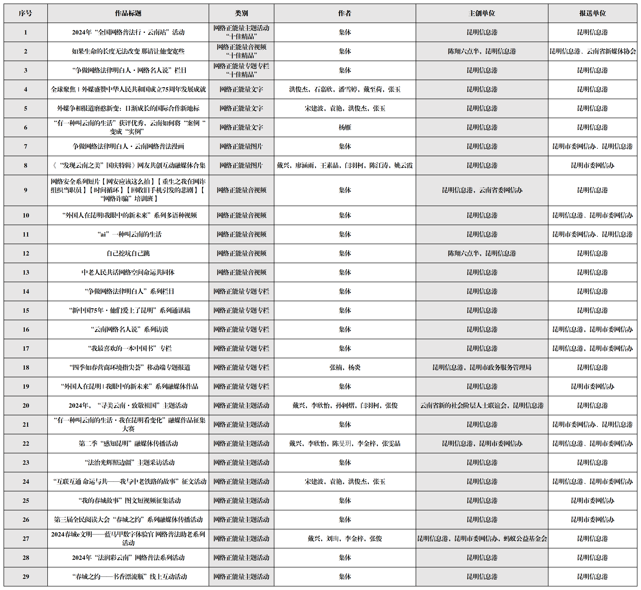 昆明市融媒体中心《我眼中的磨憨》、掌上春城《“小老板”们的春日奋斗记专题》、都市时报《“发现春城新质生产力”专题》、昆明广播电视台《城市营销短视频——你好昆明》、昆明信息港《“新中国75年·他们爱上了昆明”系列通讯稿》等11件作品入选网络正能量专题专栏。