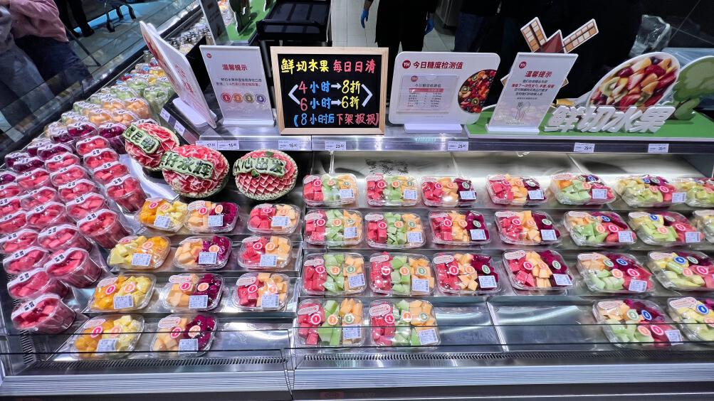 在现切水果区买完水果可以免费帮清洗、现切。此外,鲜切水果从切分完成开始计时,超过4小时打8折,超过6小时打6折,超过8小时立即下架处理。水果果切还根据甜度做编号,做品尝先后顺序推荐,避免口味不佳。