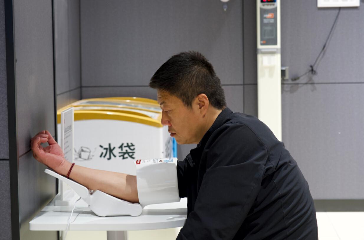 在顾客休息区,身高测量仪、医疗箱、血压计、老花镜、轮椅等设备一应俱全,更有自助取冰、直饮水、微波炉、充电宝等方便顾客购买商品后随时使用。“体验感很好,免费帮洗切水果、微波炉、自助取冰、前1小时免费充电的充电宝,每一样都是我在购物时需要的。”市民杨先生说。