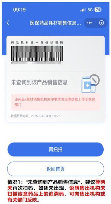 情况1:“未查询到产品销售信息”,建议等两天再次扫码,如还未出现,说明售出机构未扫描该盒药品上的追溯码,可向售出机构或有关部门反映。
