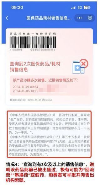 情况4:“查询到有2次及以上的销售信息”,说明该药品此前已被出售过,极有可能为“回流药”“串换药”或假药,消费者可举报并向售出机构索赔。