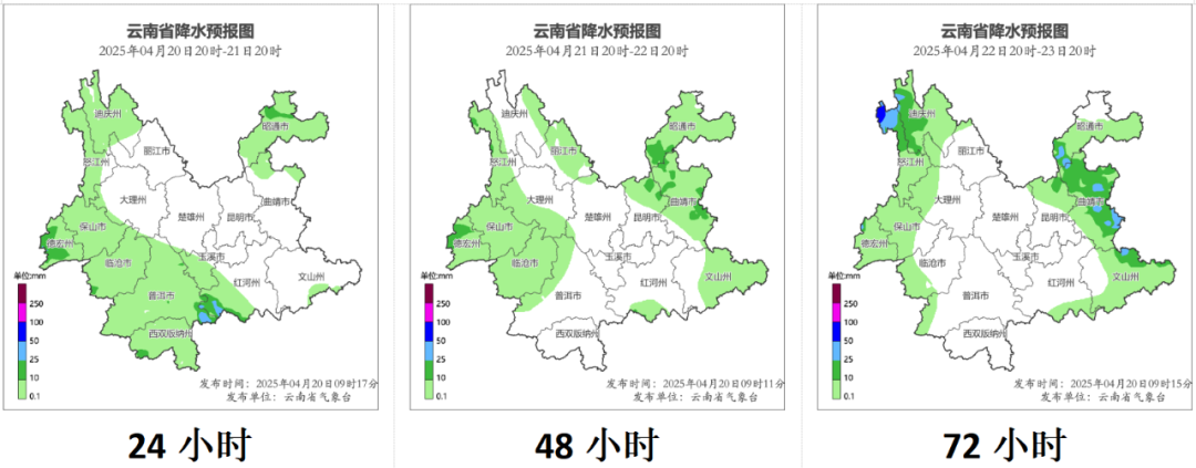 4月20日20时到4月21日20时:迪庆州、怒江州、大理州西部、保山市、德宏州、临沧市、普洱市、西双版纳州、红河州西部、文山州南部、玉溪市西部、曲靖市北部、昭通市多云有阵雨局部中雨、大雨,其他地区晴间多云。