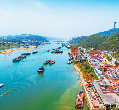 近日,在广西梧州港李家庄作业区,船舶正在进行装卸作业。该港为中国—东盟自由贸易区等提供综合物流服务。何华文 摄(人民视觉)