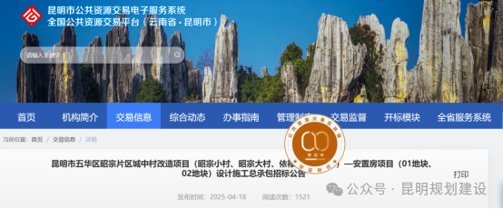 近日,昆明市公共资源交易平台发布“昆明市五华区昭宗片区城中村改造项目(昭宗小村、昭宗大村、依禄村、河底村)——安置房项目(01地块、02地块)设计施工总承包招标公告”,标志着该项目在推进过程中迈出实质性的一步。