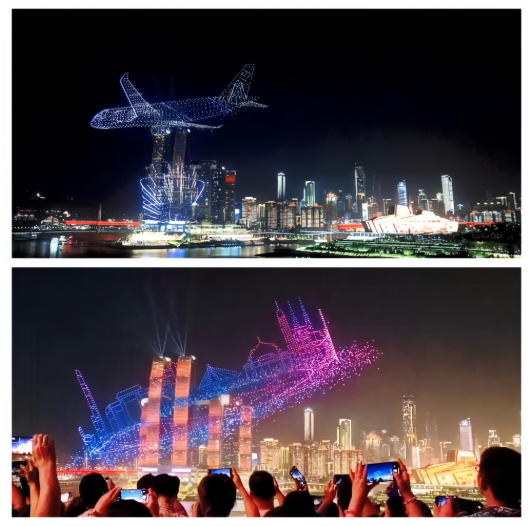 临近“五一”假期,山城重庆把无人机灯光秀从“节庆限定”变成了常态化展演。规模达5000架的无人机编队搭载着多种创新设备,吸引市民游客前来打卡,大家说,“以前追星星,现在追飞机!”