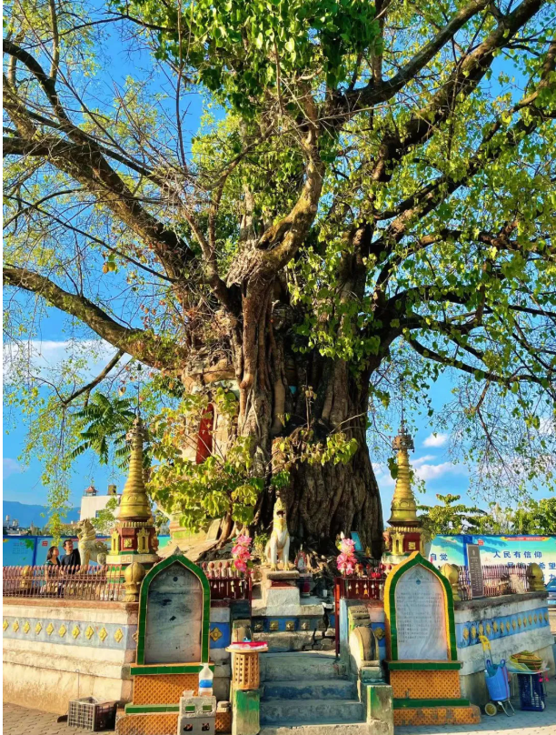身穿傣族和东南亚风格服饰的游客穿梭其中