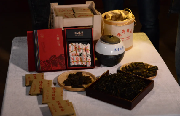德昂酸茶——德昂酸茶取材于古老的大叶种茶树,在竹筒里无氧发酵后制成。其风味独特,酸涩回甜,富含茶多酚和乳酸菌,具有清热解暑、消炎解酒、提神润喉,促进消化等作用。2022年德昂族酸茶制作技艺成功入选联合国教科文组织人类非物质文化遗产名录。
