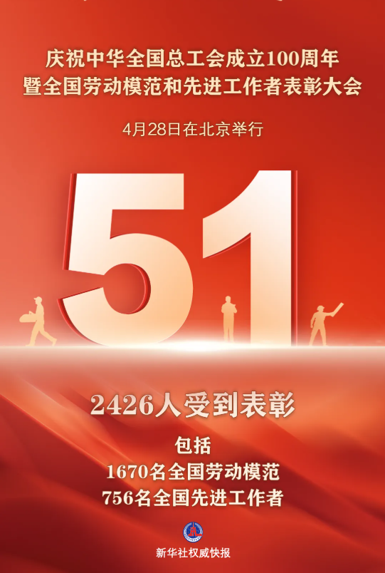 庆祝中华全国总工会成立100周年暨全国劳动模范和先进工作者表彰大会4月28日上午在北京举行,2426人受到表彰,包括1670名全国劳动模范和756名全国先进工作者。