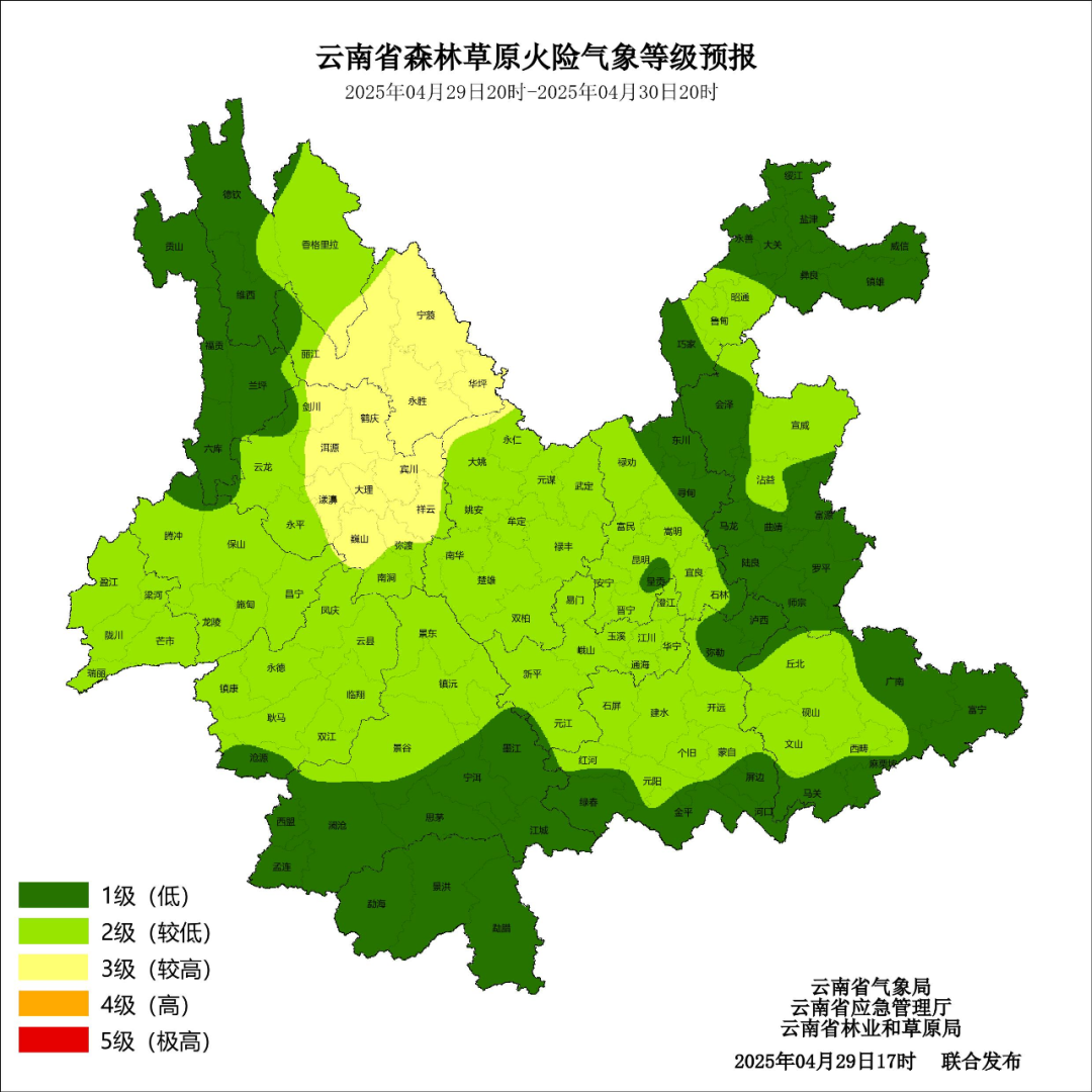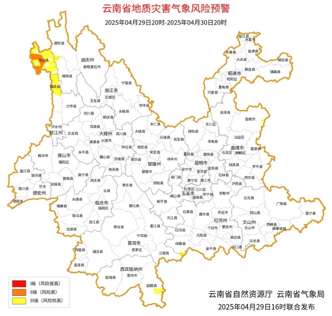 4月29日20时至4月30日20时,怒江州贡山县发生滑坡泥石流的风险高;怒江州北部,迪庆州西部发生滑坡泥石流的风险较高。