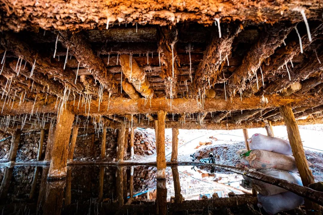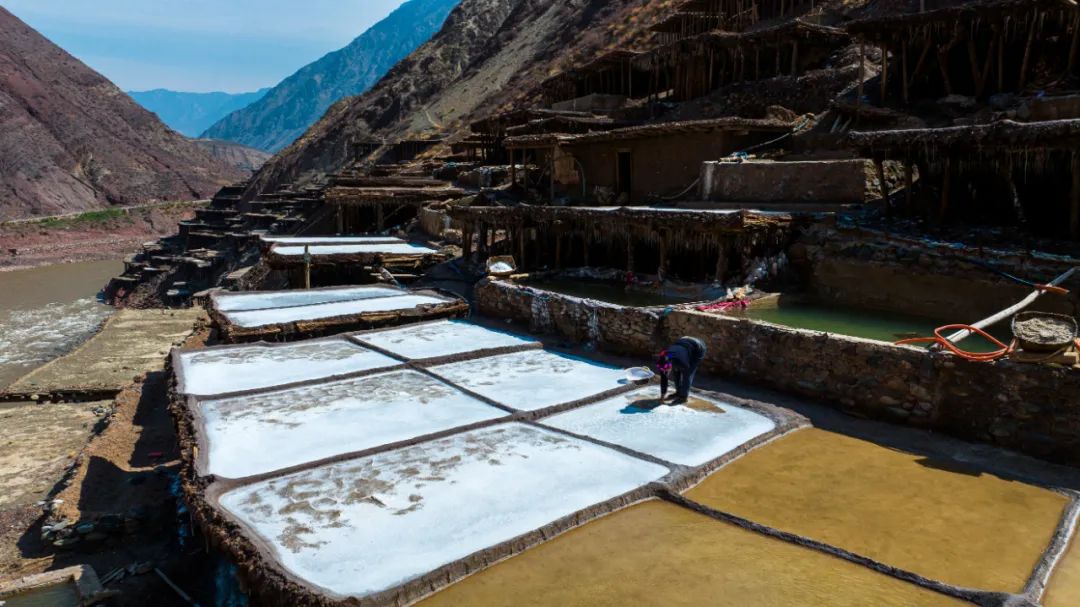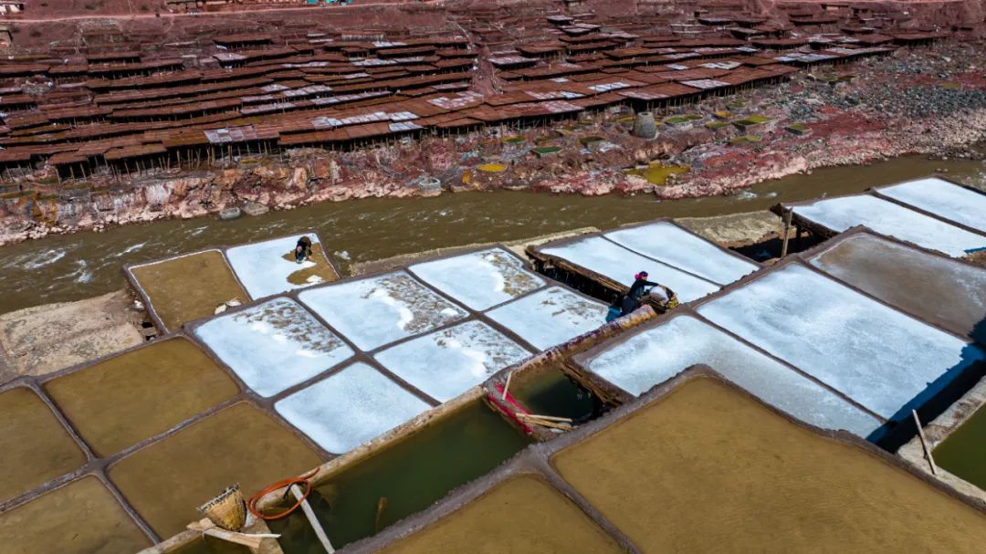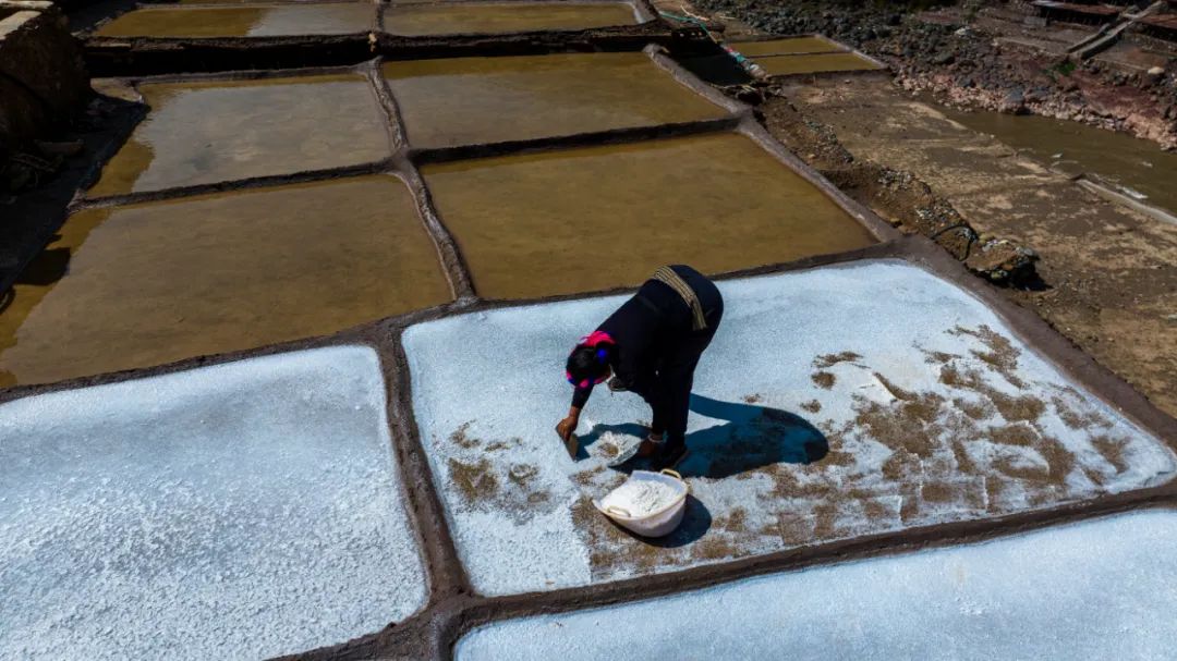 盐田上,60岁的乃柯正和丈夫一起,用木拍夯实盐田。“现在用泵抽水轻松多了,但拍盐田的手艺不能丢。”老人的话语中,既有对科技的接纳,也有对传统的坚守。盐田下方,盐晶垂落成帘,在山风拂动下闪烁微光,仿佛在诉说着千年文明的厚重。