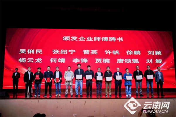 活动还特别表彰了2023级10名“优秀学徒”及12名“优秀师傅”。作为企业“师傅”代表,昆明市大数据协会秘书长吴俐民鼓励青年学子,“师徒结对从来不是简单的技艺复制,而是工匠精神基因的解码传承。我们愿做学徒职业路上的‘提灯人’,与企业、学校共筑‘育人共同体’。”现场,12名“学徒”代表以庄重的拜师仪式向来自行业的“师傅”们行礼拜师。未来,这些承担着校企合作精神的“师傅们”将从思维、技能、行为、认知等方面全方位引领学生进行行业和技能指导。
