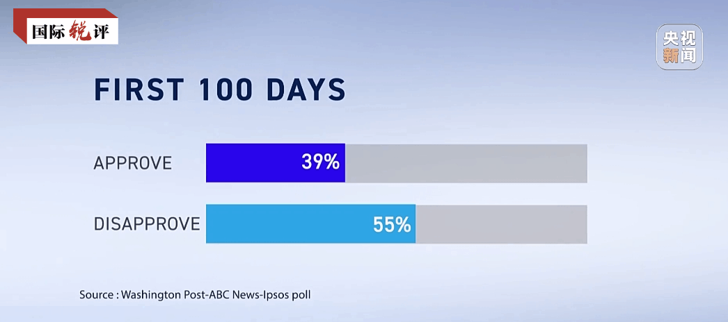 “史无前例的破坏和混乱”“史诗级失败”“充满破坏性的100天”……4月29日,当本届美国政府执政满一百天,迎接它的不是鲜花与掌声,而是国内外铺天盖地的批评与谴责。民调数字更加冰冷——根据美国媒体日前发起的一项联合调查,55%的受访者对本届政府的执政表现持否定态度,创下过去80年来同期最差纪录。