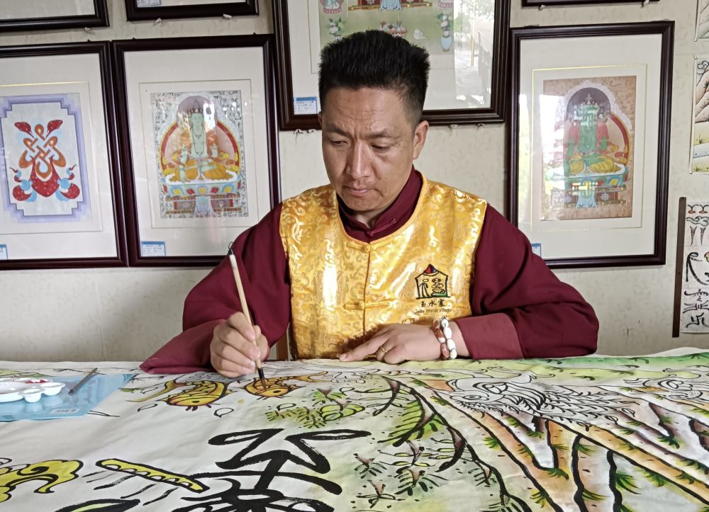 他带着徒弟将东巴图腾融入茶具、丝巾、团扇,让“神鹿”“莲花”走进现代生活;在中小学校开设东巴画课程,孩子们用稚嫩的笔触画下“风、云、爱”;玉水寨的文旅融合项目中,游客不仅能观赏东巴画,还能体验一幅东巴画的诞生。