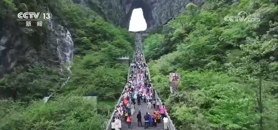 在湖南张家界天门山景区,“五一”假期开展了非遗民俗秀活动。民俗民间艺人们开展非遗巡游,表演了土家舞狮、土家三棒鼓、土家梯玛舞等具有浓郁土家族特色的节目,吸引中外游客驻足观看。