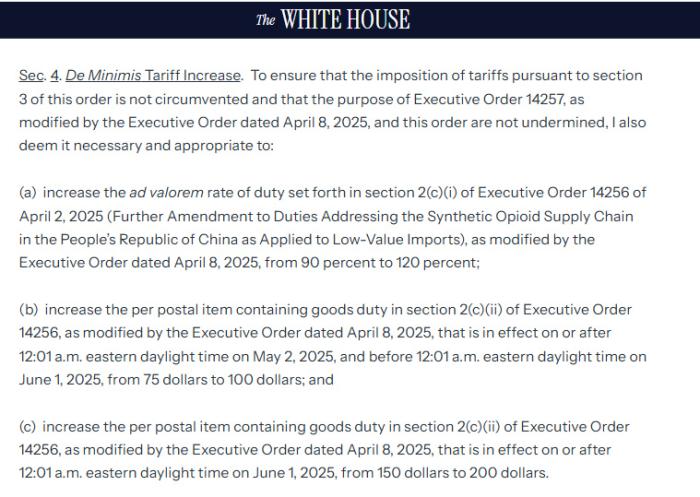 根据白宫4月9日发布的公告,自5月2日起,对含有来自中国内地和香港的货物,且价值等于或低于800美元的包裹,征收相当于货值120%或100美元的关税。