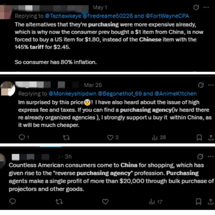 网友注意到“越来越多的美国消费者奔赴中国购物”,还有人认为“消费者承受着80%的通货膨胀”“购买的替代产品更贵了”“如果能找到代购就好了”……