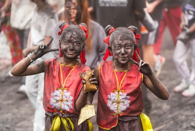 5月2日,两名身着哪吒服装的小朋友在墨江参加“抹黑脸”狂欢。新华社记者 陈欣波 摄
