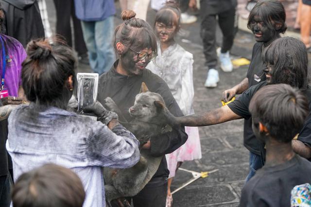 5月2日,一名游客带着宠物狗在墨江参加“抹黑脸”狂欢。新华社记者 陈欣波 摄