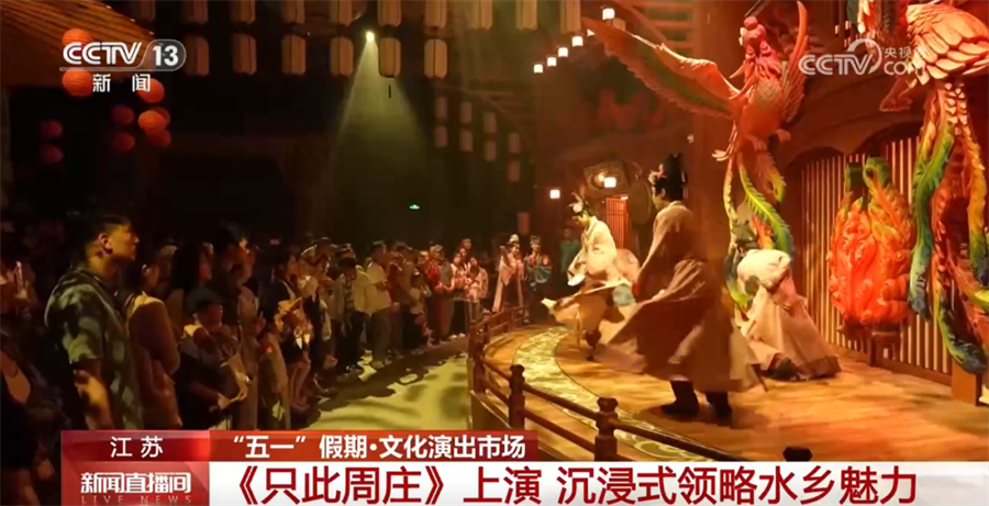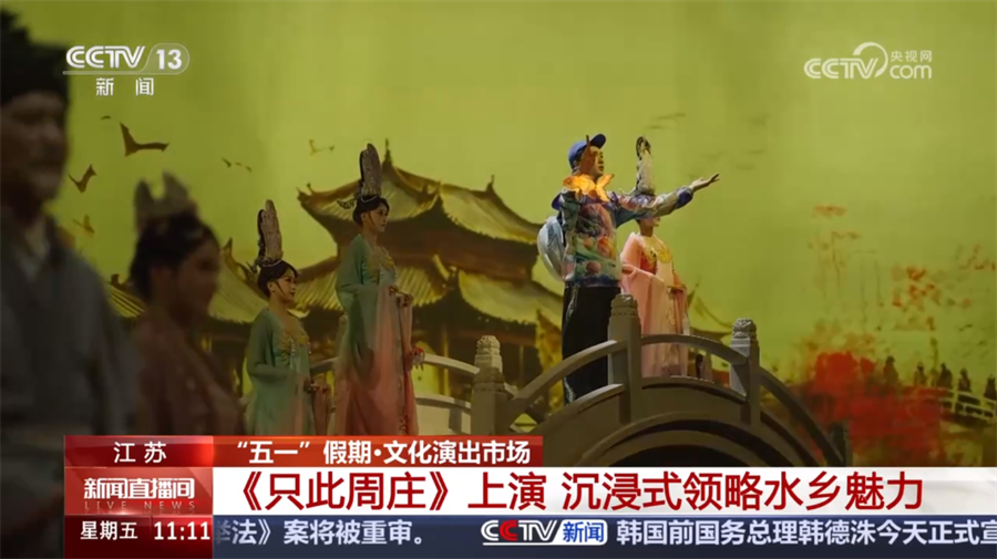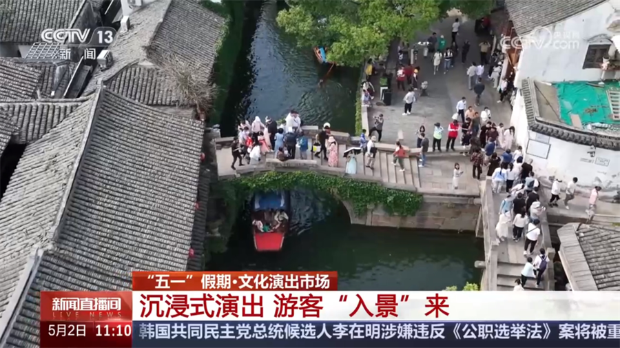 五一假期,央视镜头聚焦周庄,焕新上演的《只此周庄》获关注。游客仿佛一瞬间穿越回宋朝,“看戏人”成为了“入戏者”。