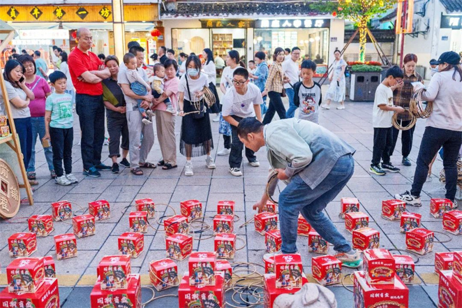 全福南路的“水乡雅集” 热闹非凡,剪纸艺人指尖翻飞;套圈游戏摊前,人们摩拳擦掌,期待能套中心仪的小物件。
