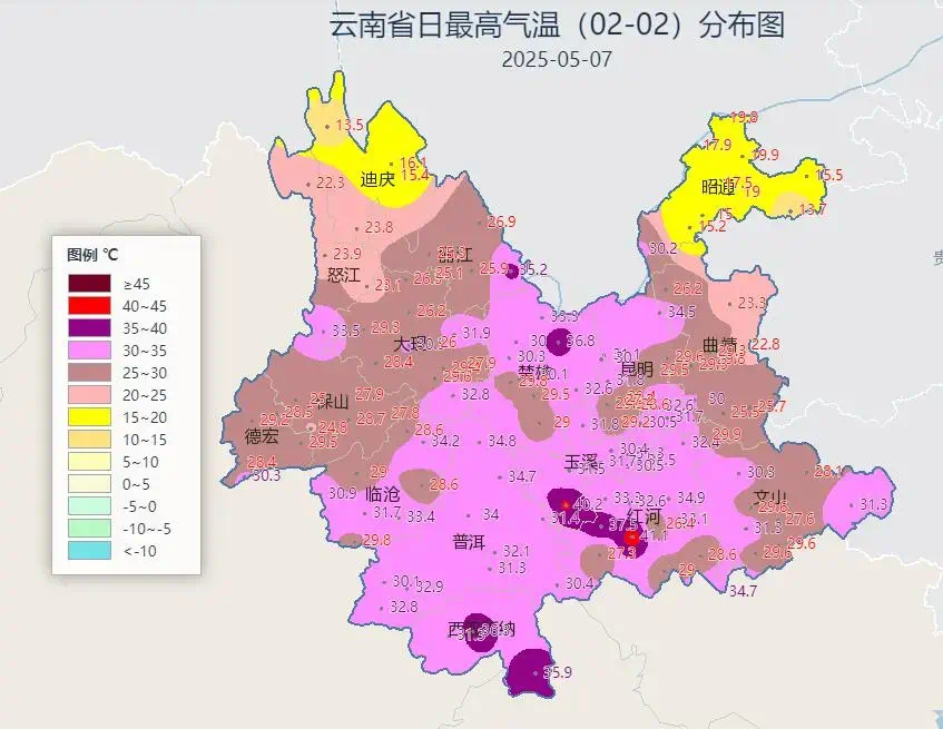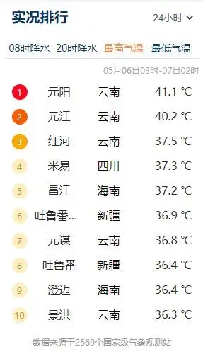 云南省多地过去24小时最高气温冲进全国最高气温排行榜前十,元阳、元江日最高气温更是冲破40℃,高居第一、第二。