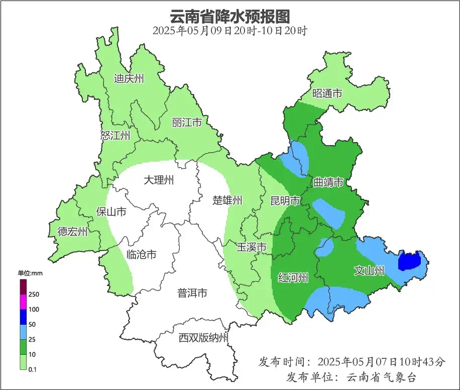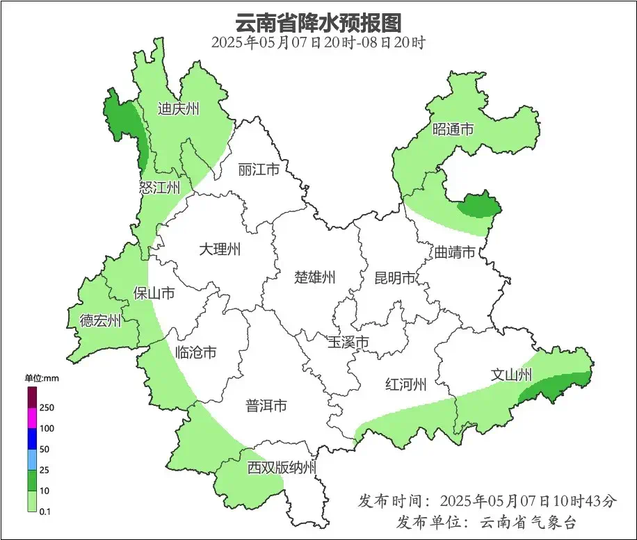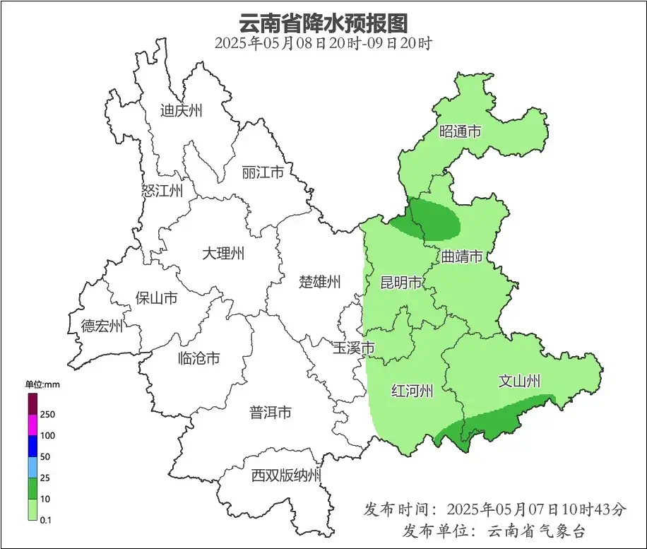 5月7日20时到5月8日20时:昭通市、曲靖市北部、文山州南部、红河州南部、迪庆州、怒江州、保山市西部、德宏州、临沧市西部、普洱市西部、西双版纳州西部多云有阵雨局部中雨,其他地区晴。