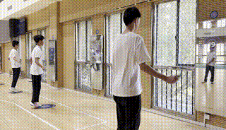 12面魔镜被固定在墙上,每面魔镜前学生4人一组,队首学生根据屏幕上的指令,同时开始了跳绳大PK。