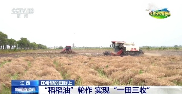 在江西抚州崇仁县孙坊镇的一个合作社,近200亩冬油菜正在收割。今年合作社按照江西省推广的“稻稻油”轮作模式,利用冬闲田种植油菜新种,不仅让农田实现“一田三收”,同时配套良种、良法、良机,油菜亩均产量也从往年的每亩150斤提高到今年的200斤左右。