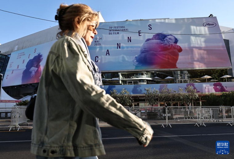 5月12日,在法国南部海滨城市戛纳,一名行人经过电影宫外的戛纳国际电影节海报。 新华社记者 高静 摄