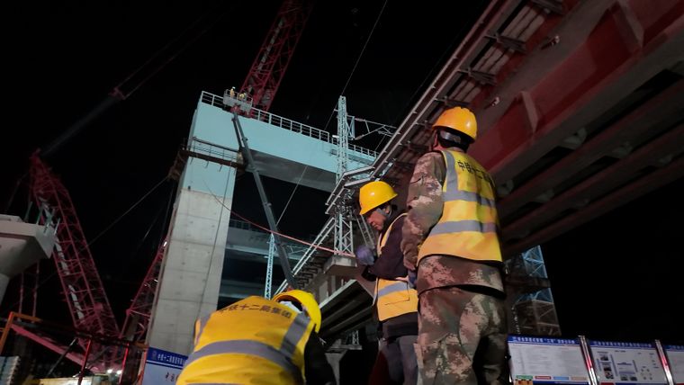 5月13日凌晨0点30分,由中铁十二局承建的大理铁路枢纽工程迎来关键时刻——关凤大道双线特大桥第五段门式墩钢盖梁的吊装作业正式开始,由于大桥跨越运营中的昆楚大铁路,所以每天只有在夜间列车停运的窗口期进行分段吊装,吊装作业要在一百多名作业人员和大型设备的配合下,在凌晨4点钟完成。