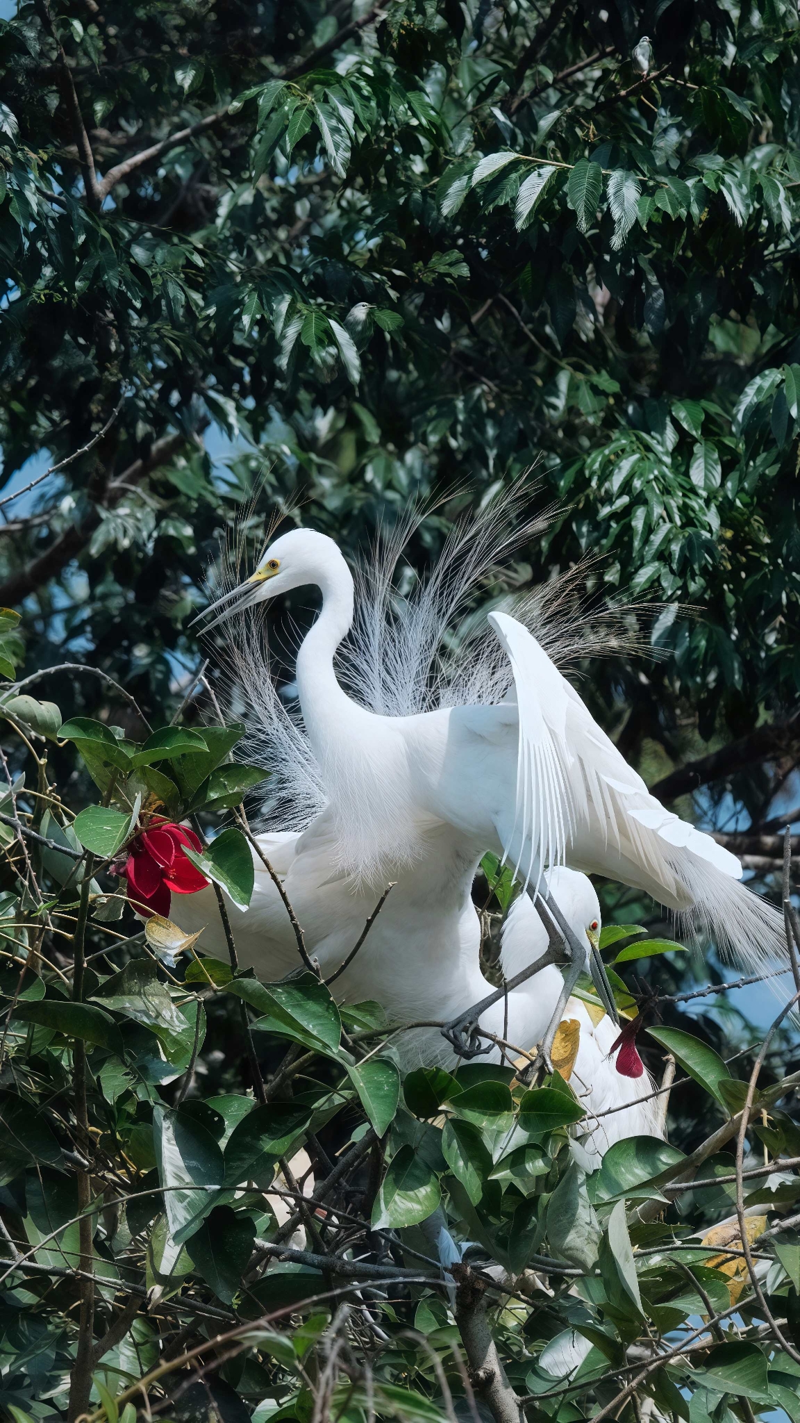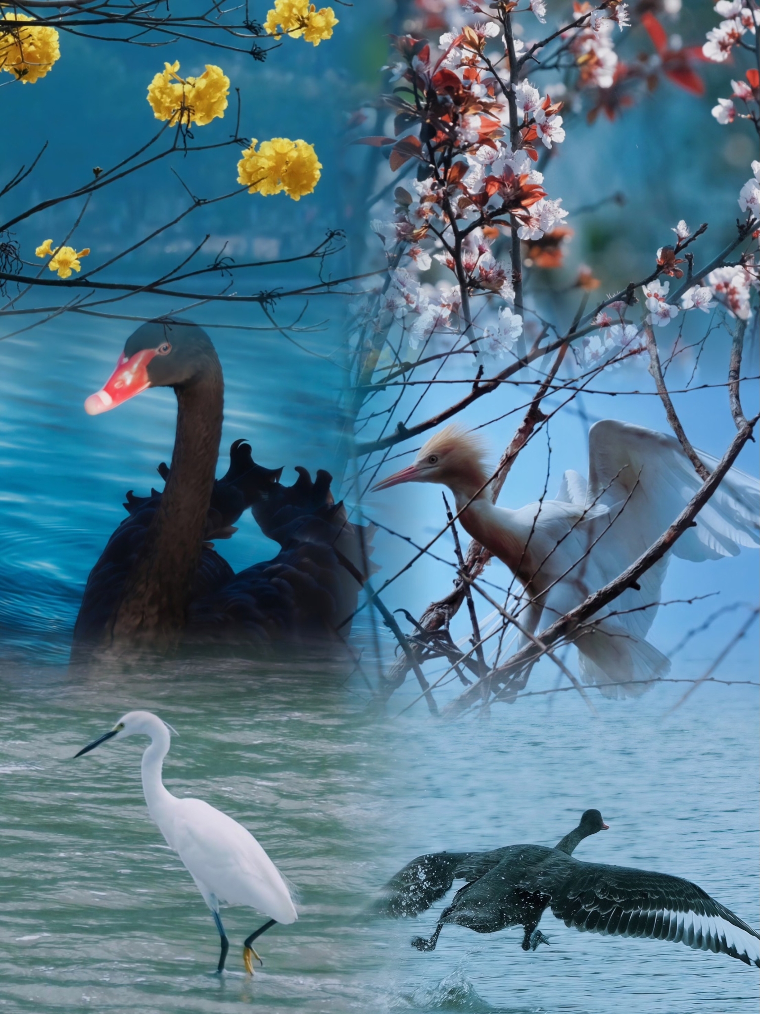 玉龙湖的湖心小岛上聚集着数十只白鹭,它们或悠闲地晒着太阳,或在湖边专注觅食,雪白的羽毛与繁花绿影相衬,显得清逸出尘。一阵风过,白鹭群忽而展翅高飞,在空中盘旋翱翔,为静谧的湖面增添了几分灵动。