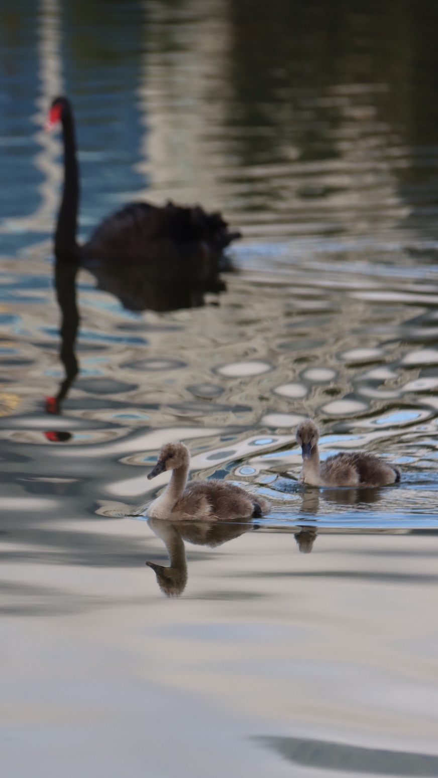 波光粼粼的湖面上,有的黑天鹅在曲颈梳羽,有的优雅地游弋着,有的带着宝宝出游觅食。