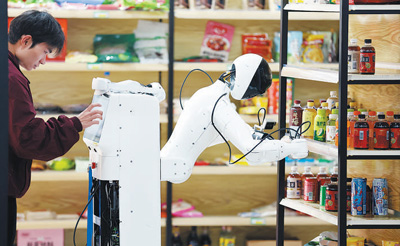 上海首座人形机器人量产工厂——上海智元新创技术有限公司一期工厂近期实现大规模量产。该企业共推出5款机器人,涵盖多个领域。图为工程师在训练人形机器人采集货架信息。