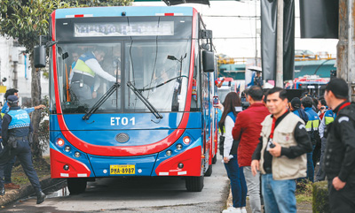 图为在厄瓜多尔首都基多,人们体验宇通双源无轨电车。里卡多·兰德塔摄(新华社发)