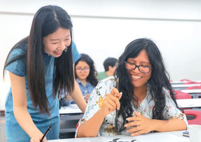 图为在秘鲁利马,秘鲁天主教大学孔子学院中文教师梁卿(左)辅导秘鲁学生写书法。玛利亚娜·巴索摄(新华社发)