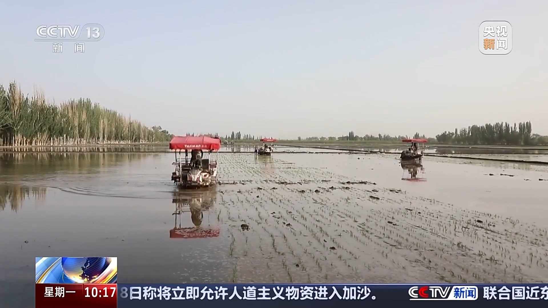 在阿拉尔市塔南镇的稻田里,四台插秧机正开足马力作业,一排排嫩绿的秧苗被整齐地栽入田间。一台插秧机每天可完成40多亩稻田插秧,效率是人工的50倍,还能精准控制秧苗行距和间距。今年,当地在水稻育秧期间,通过错峰放水控制稻种发芽时间,来统一秧苗生长期,确保秧苗在适合的时间下田栽种,提高水稻成活率和生长品质。