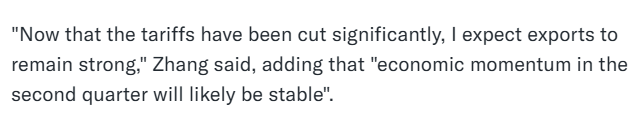 报道援引保银投资总裁、首席经济学家张智威的观点指出,尽管美国提高了关税,但中国出口仍保持韧性。这位分析人士预计,“现在关税已经大幅下调,预计出口将保持强劲”。“第二季度中国经济增长势头或将保持稳定。”