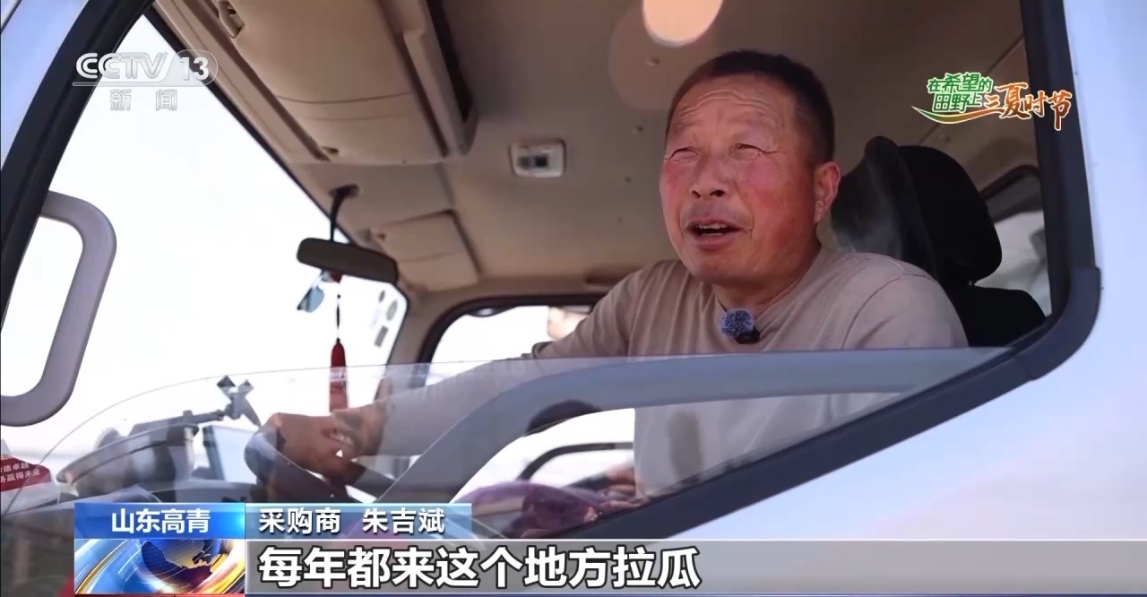 采购商 朱吉斌:我从天津过来拉瓜,每年都来,这里的瓜口感好,今年拉了一万五千斤。