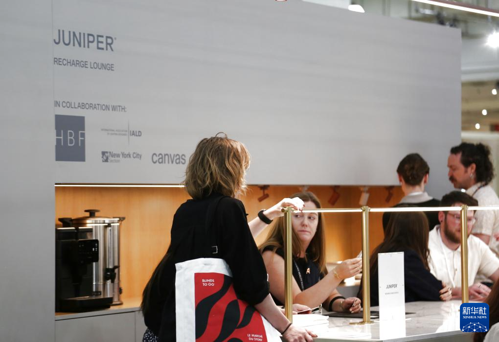 5月18日,在美国纽约举行的2025年国际当代家具展现场,人们在美国灯饰设计和制造企业朱尼珀设计集团公司与美国北卡罗来纳州家居和纺织品生产商HBF纺织品公司的展区参展。新华社记者 刘亚南 摄