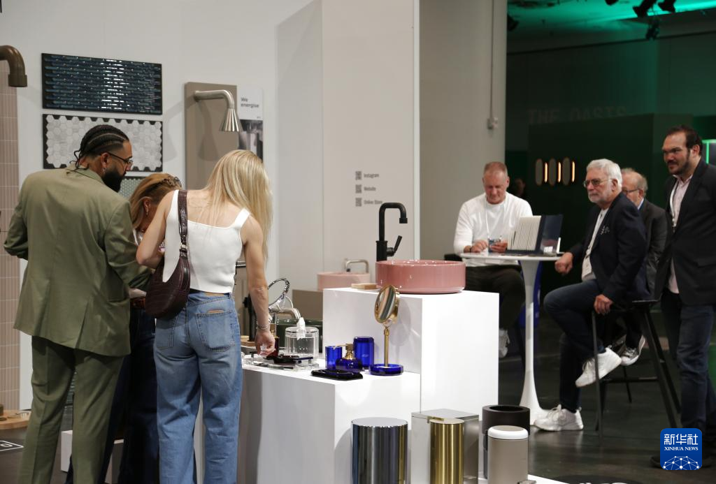 5月18日,在美国纽约举行的2025年国际当代家具展现场,人们在美国康涅狄格州家具企业赫勒公司的展区参展。新华社记者 刘亚南 摄