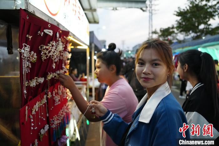 3月23日,缅甸工人在瑞丽沿边产业园胞波街逛街挑选饰品。中新社记者 刘冉阳 摄