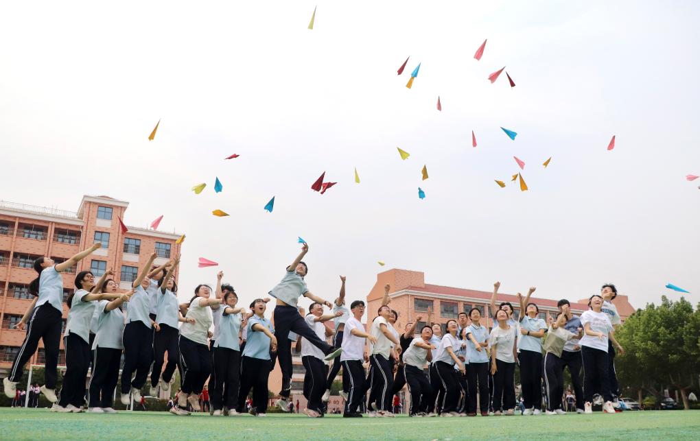 5月22日,在山东省高密市第五中学,高三学生将写有梦想的纸飞机抛向空中。高考临近,各地学校组织高三学生开展不同形式的减压活动,帮助学生放松心情,迎接高考。 新华社发(李海涛摄)
