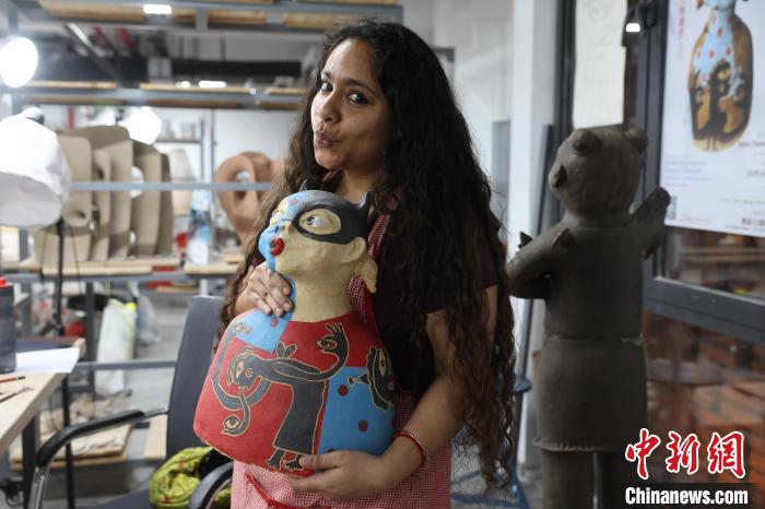 在斯里尼亚·乔杜里的工作台上,泥坯造型奇特有趣,同时绘制着俏皮可爱的图案,丰富多彩的颜色更添一份印度风情,作品既保留了印度雕塑的繁复韵律,又浸润着景德镇传统技艺的质感。在景德镇,斯里尼亚·乔杜里找到了文化交流与融合的无限可能。她表示,希望通过自己的作品,让更多人了解印度文化与陶瓷艺术融合的魅力。
