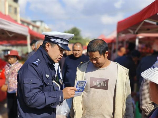在集市,社区交警开展“交通安全赶集”活动,通过面对面宣传、发放宣传资料等方式,重点对农村道路交通安全知识、交通安全注意事项进行宣讲,引导群众增强安全防范意识。