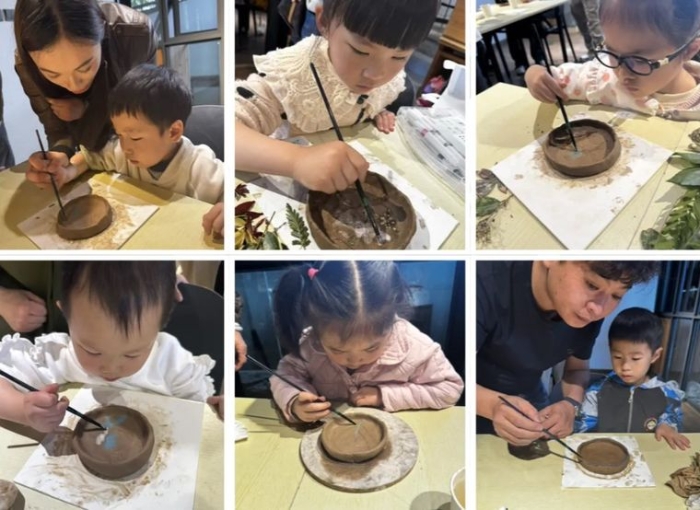 小朋友们在爸爸妈妈的陪伴下,自由选择色彩为作品上色,尽情表达创意。上色完成的陶盘再次送入烘烤定型。