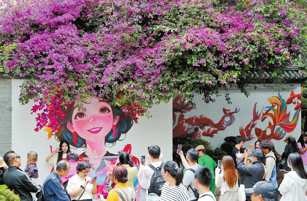 端午假期,昆明中和巷的三角梅“簪花少女”和锦鲤花墙吸引了市民和游客前来打卡。 本报记者 杨峥 摄