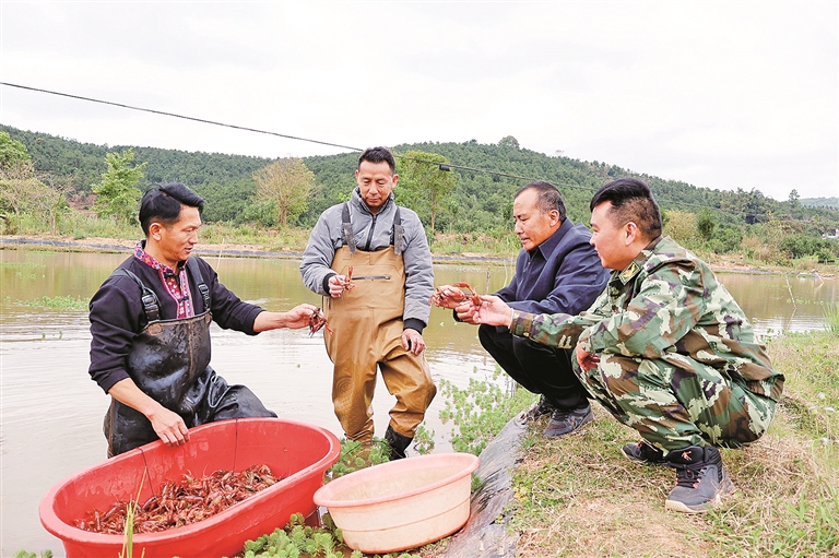 近年来,景洪市景讷乡依托土地平整连片、水利设施完善的优势,大力推行稻虾综合种养模式。同时,培养一批理念新、懂技术、会经营的农村致富带头人,推动产业发展壮大、群众增收致富,串起了生态效益与经济效益的双赢链条。图为省级农村致富带头人白贵梁(左一)在田间开展养殖技术培训。(通讯员 邓倩/摄)