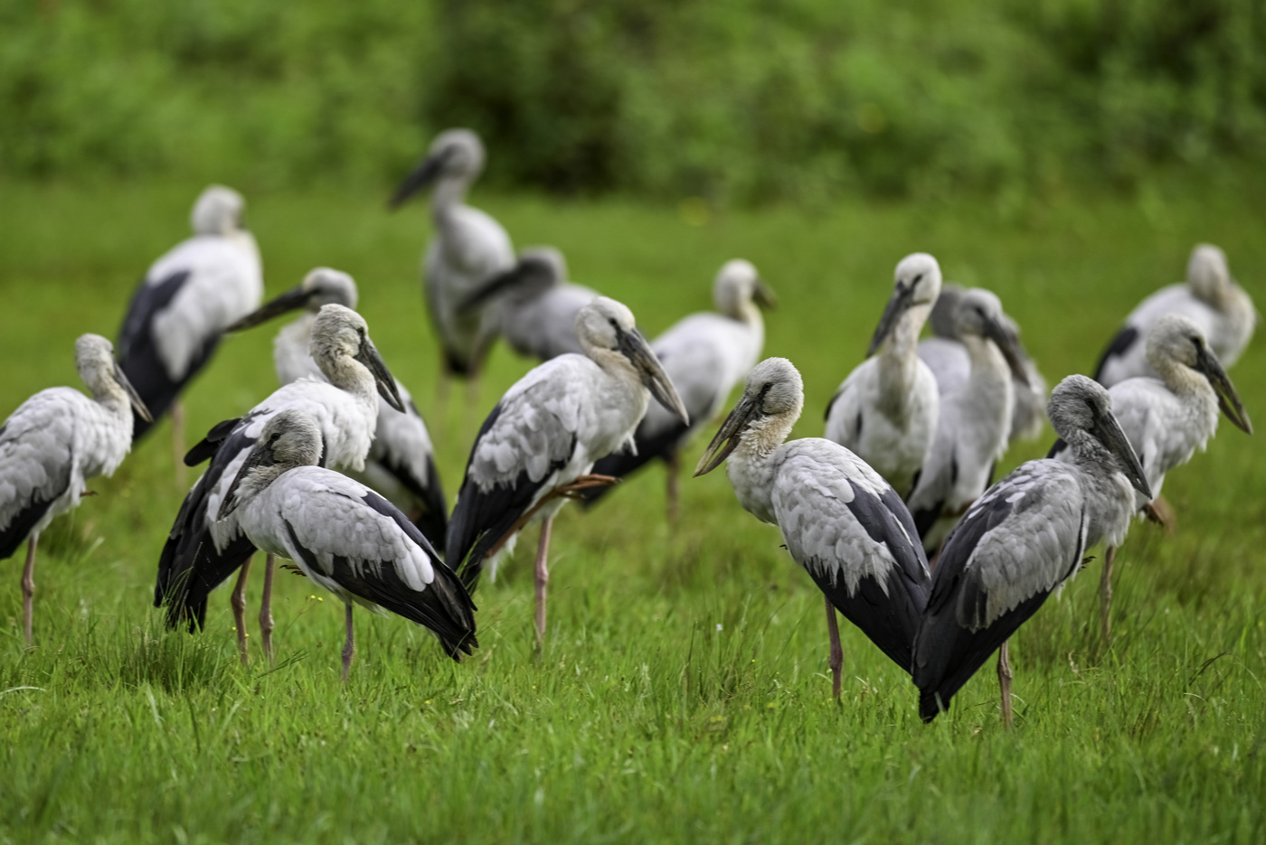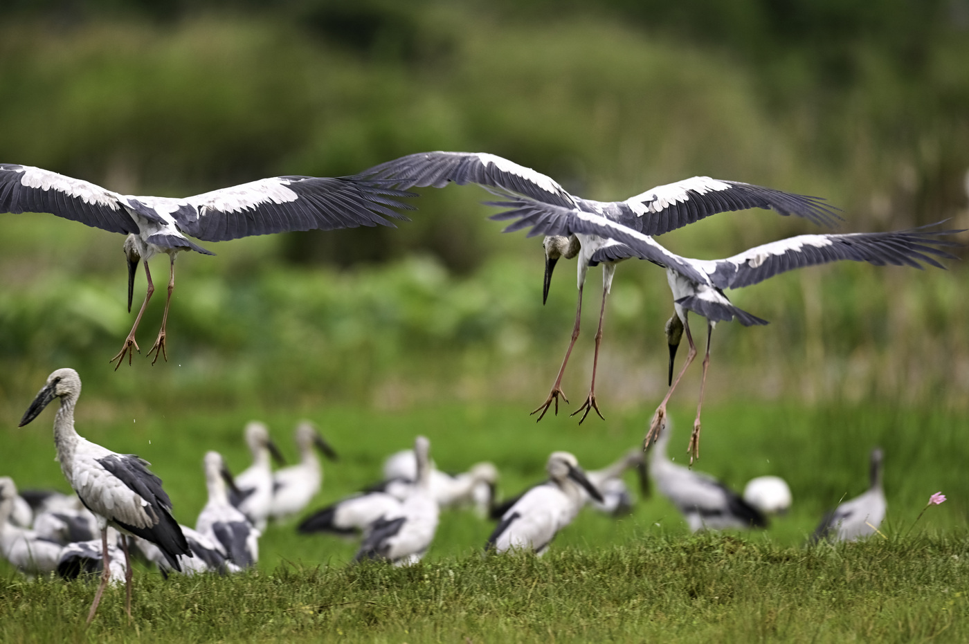 钳嘴鹳是捕食外来入侵物种福寿螺的高手,其喙中部呈凹陷状,形似被“钳住”,非常适合捕捉蜗牛、螺类等软体动物。凭借这一“专长”,它被人们赞誉为湿地生态系统的“清道夫”,对维护湿地生态平衡发挥着关键作用。据文山州丘北县的普者黑国家湿地公园观测人员记录,共有200多只钳嘴鹳来此栖息繁殖。