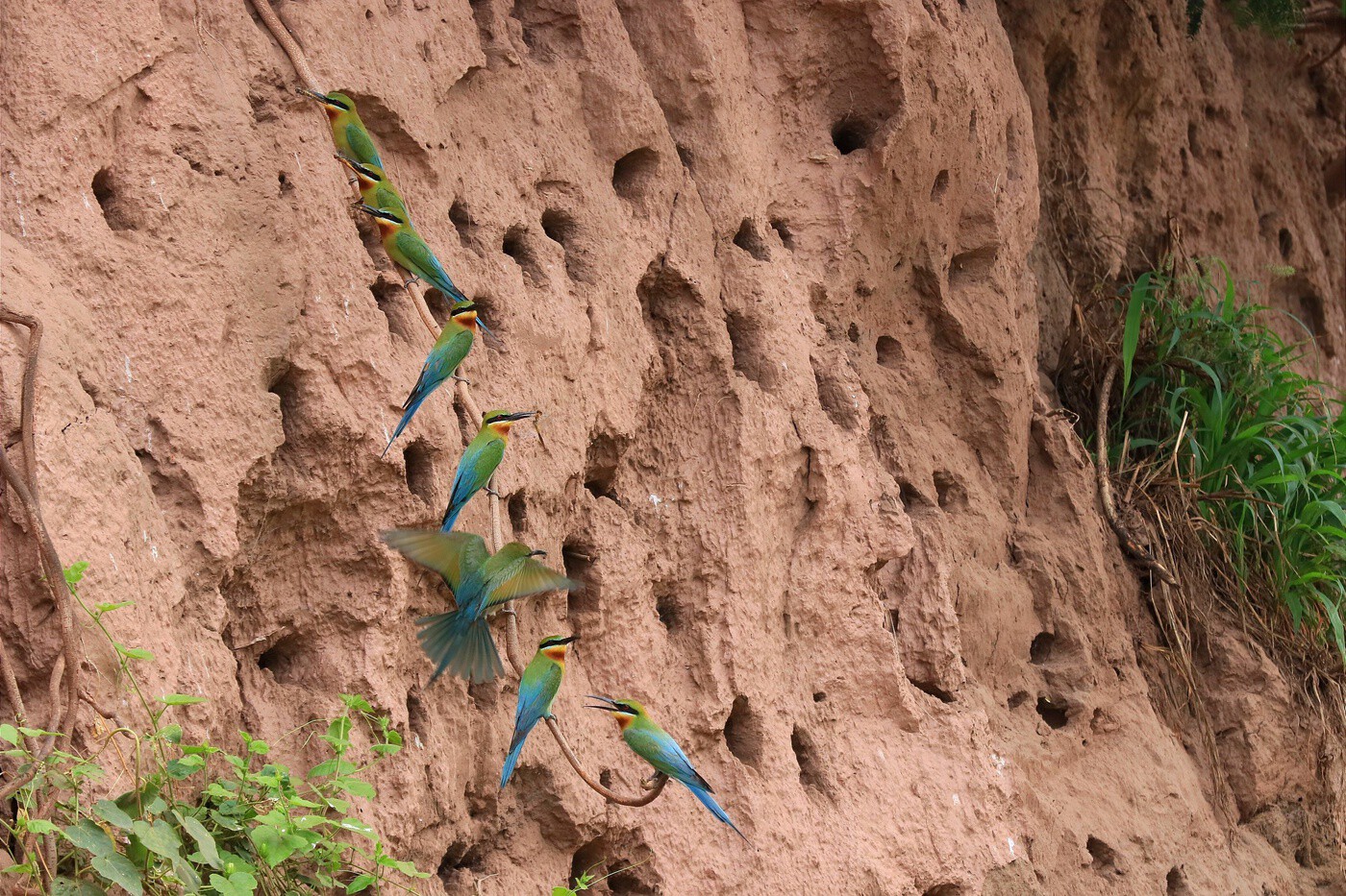 在骄阳似火的元江河谷,生活着一群美丽的“精灵舞者”。它们在元江两岸的沙壁上打洞筑巢、繁育后代。近年来,得益于元江河谷地区生态环境的持续改善以及当地百姓对候鸟的保护,吸引了部分栗喉蜂虎留栖元江。目前,生活在元江县境内的野生蜂虎种类繁多,种群数量已达到约1万只,吸引了众多摄影爱好者前来。